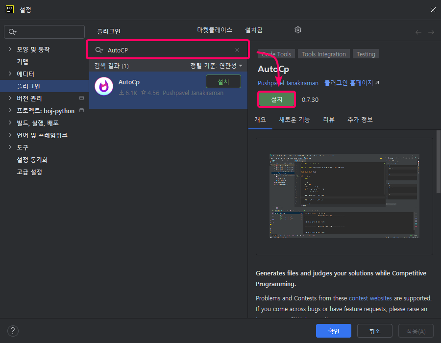 최신 빌드로 업데이트 후에도 마켓플레이스에서 플러그인을 다운로드할 수 없다면, https://github.com/Pushpavel/AutoCp/releases 에서 최신 AutoCP 플러그인을 설치하세요.