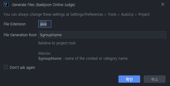 IDE가 켜져 있다면, 자동으로 파일 생성 다이얼로그가 표시됩니다. '확인'을 눌러 파일을 생성하세요.