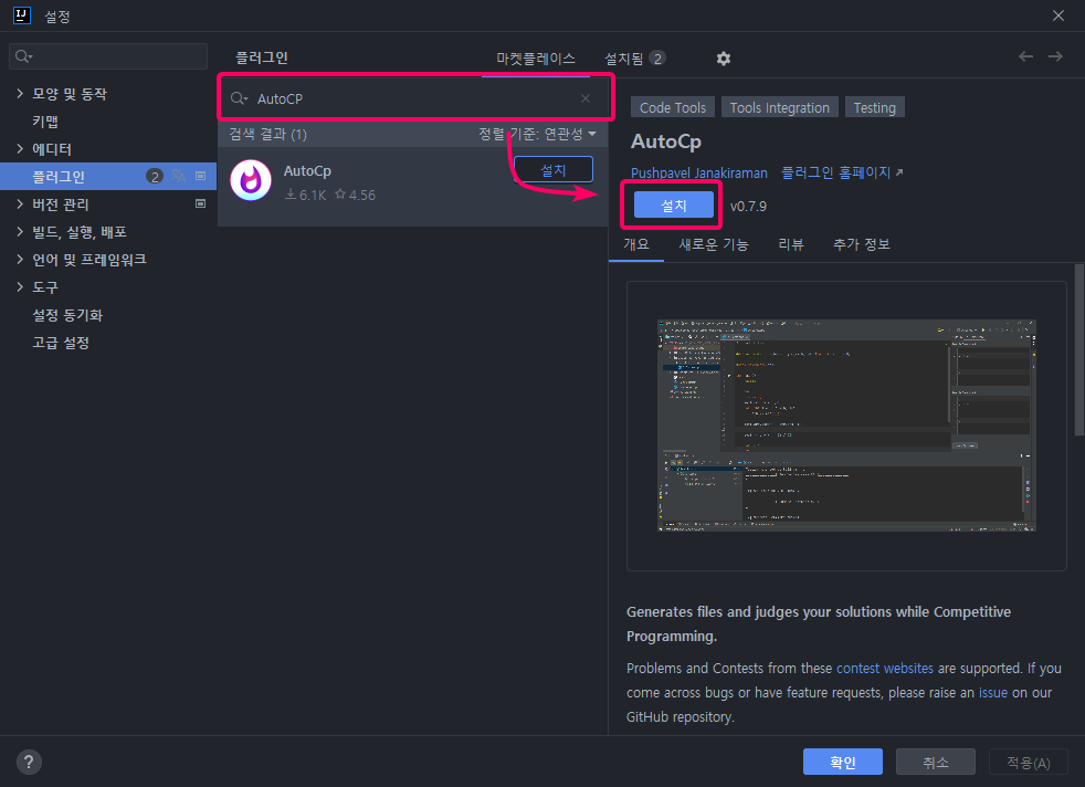 AutoCP 플러그인은 인텔리제이 설정 메뉴에서 플러그인 마켓플레이스를 이용하여 설치할 수 있습니다.