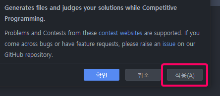 아래 컨텍스트에서 '적용' 버튼을 눌러 플러그인을 IDE에 적용합니다.