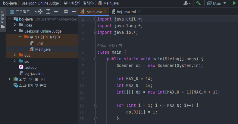 문제 이름으로 생성된 소스코드 파일에 알고리즘 문제 해결 로직을 작성합니다.